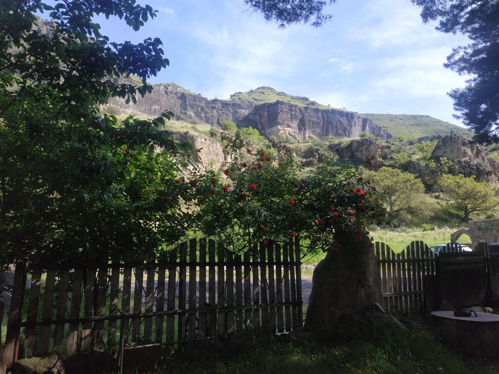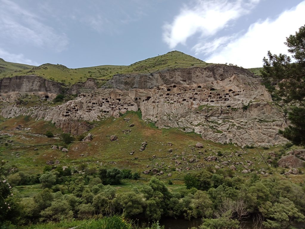 On tourne à son pied et remonte la vallée de la Koura, on pourrait se croire en Suisse où en Slovénie. C’est doux à voir, bien agencé, vert, propre et net y compris la route et la signalisation, la montagne partout où le regard se pose. Nous arrivons à Vardzia, non sans avoir repéré trois endroits possibles pour nous poser en bivouac dans l’auto. Le temps est menaçant aussi nous nous posons pour notre pique nique sur un joli point de vue en face du site des habitations troglodytes.