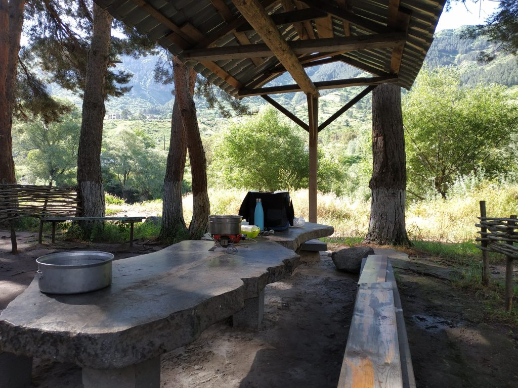 Après le pont, un petit restaurant et signalé comme « Park Kamp » au bord de la rivière semble être une invitation, avec ses petites tables sous les pins. On a donc trouvé là notre bivouac avec toilettes mais sans douches, on a la nôtre sur l’auto mais y’a pas d’urgence, vu la température montagnarde, la propreté attendra.