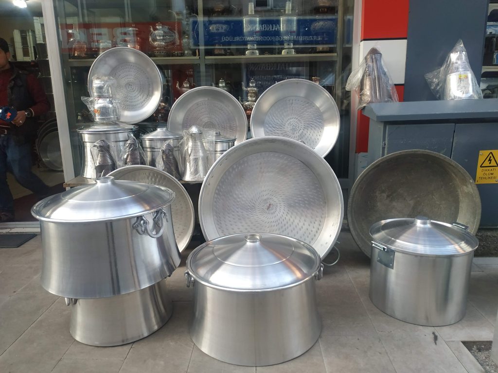 Dans notre quartier, beaucoup de petites fabriques d’ustensiles de cuisine en aluminium ou inox, ici les modèles familles nombreuses ou pour les professionnels. Je ne me lasse pas de fouiner dans ces boutiques…