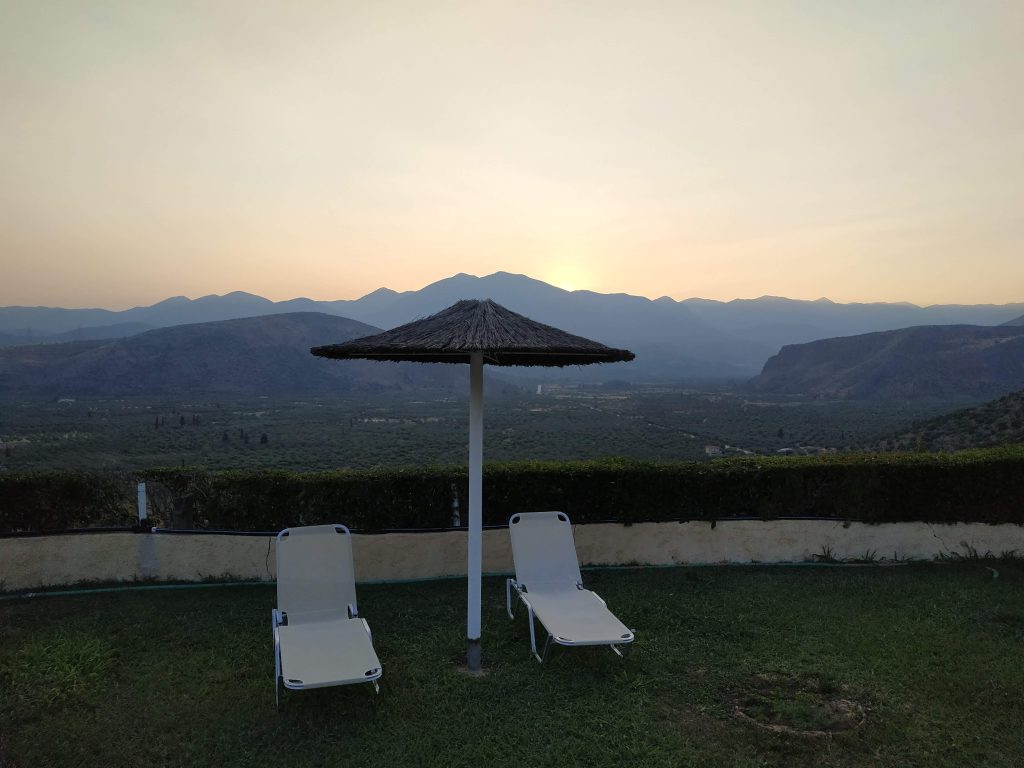 Le site de Delphes doit se trouver derrière ce parasol. Dans le creux formé entre ces deux montagnes au second plan.