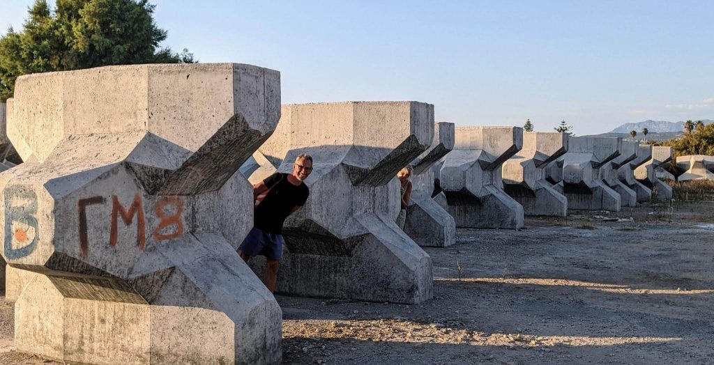 Deuxième journée ici, avec un emploi du temps de patachons : thé, baignade masque et tuba aux rochers tout proches. Retour au camping et baignade en piscine. Ouzo léger du midi, salade Grecque maison, café-sieste dans les hamacs. Baignade au village près de l’épave dans les rochers, courses pour ce soir, Ouzo du soir au café du centre, retour au campement. On frôle le burn-out, j’envisage un signalement.