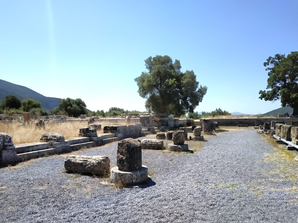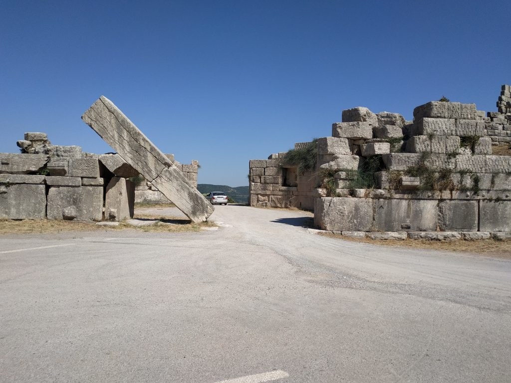L’entrée dans l’ancienne Messini (site archéologique) se fait par la route, qui traverse sans vergogne la plus grande muraille de Grèce (9 kms tout de même) au niveau de la porte d’Arcadie. On y passe non sans émotion, à côté d’un linteau de pierre impressionnant par sa masse, et par son équilibre incertain. On se sent gêné de rouler en voiture au milieu de ces vestiges historiques.