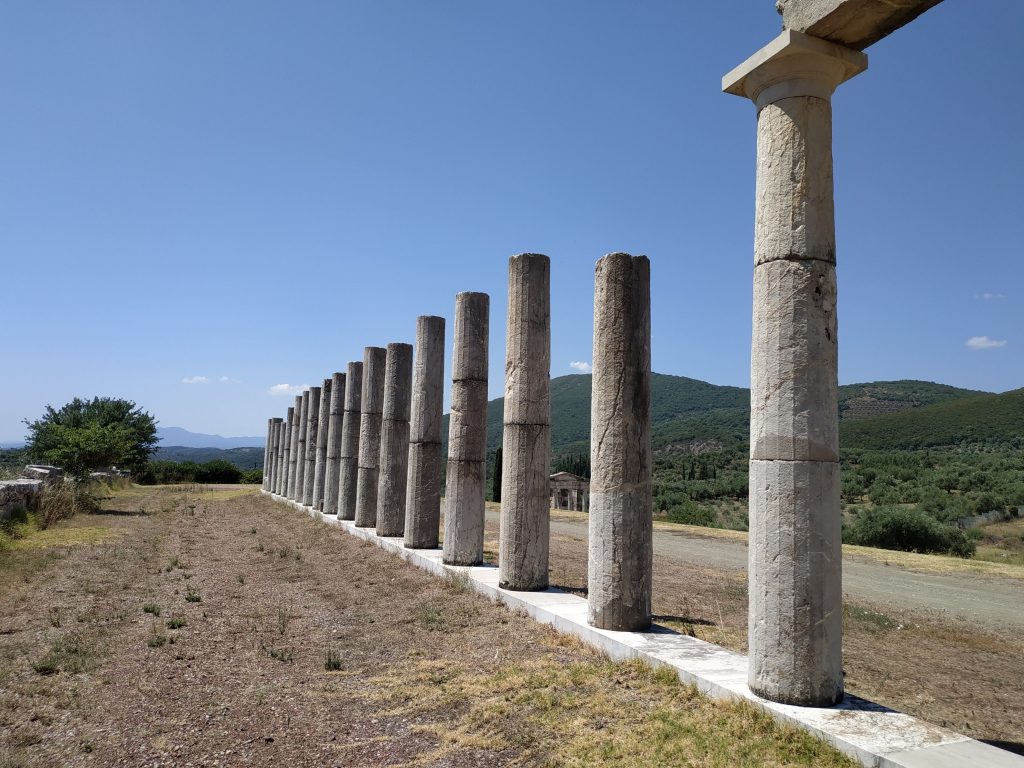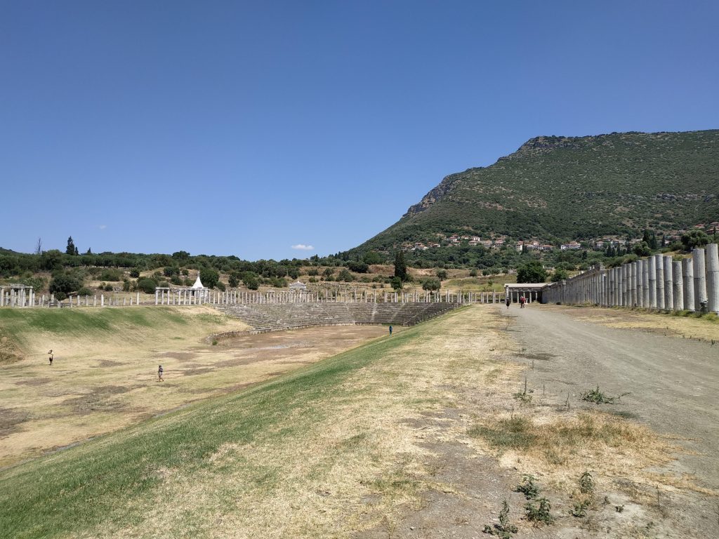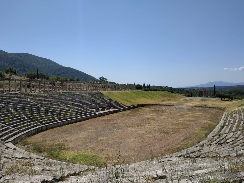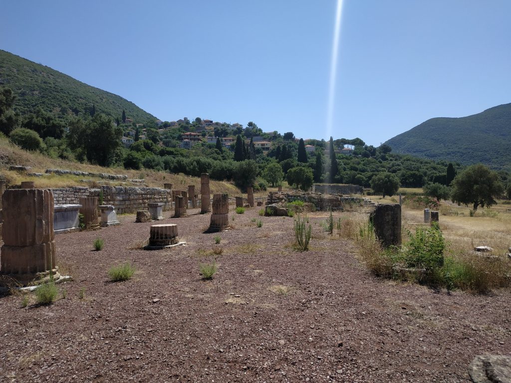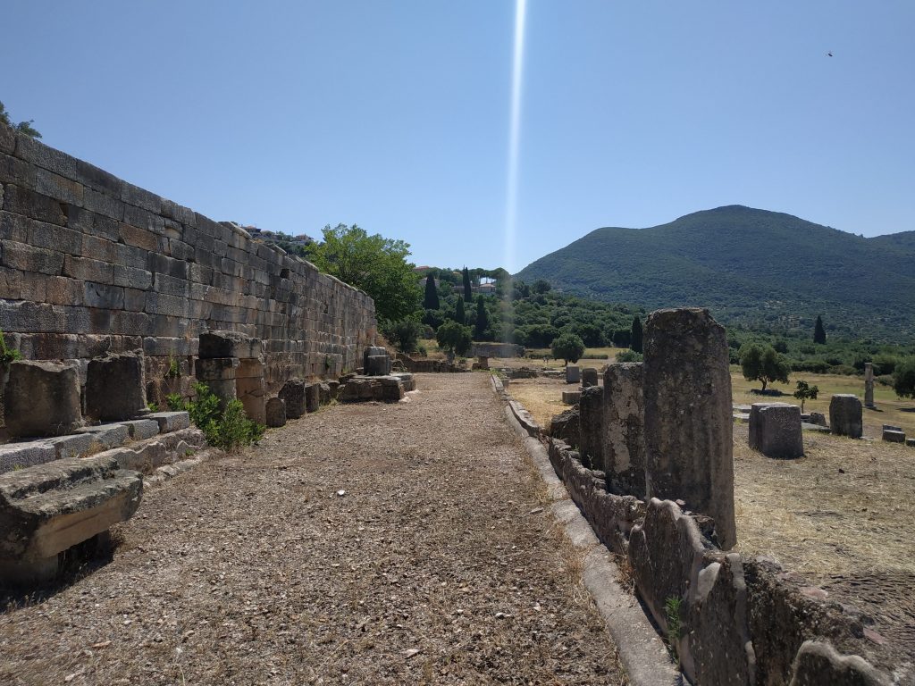 La ville de Messini, créé au 3ème siècle avant JC est lovée dans un site naturel exceptionnel : adossée au nord entre deux montagnes modestes qui la protège par le haut avec le théâtre et la source, et s’étend au sud en prenant le temps, en pente douce et régulière jusqu’aux extrémités du stade et du gymnase.