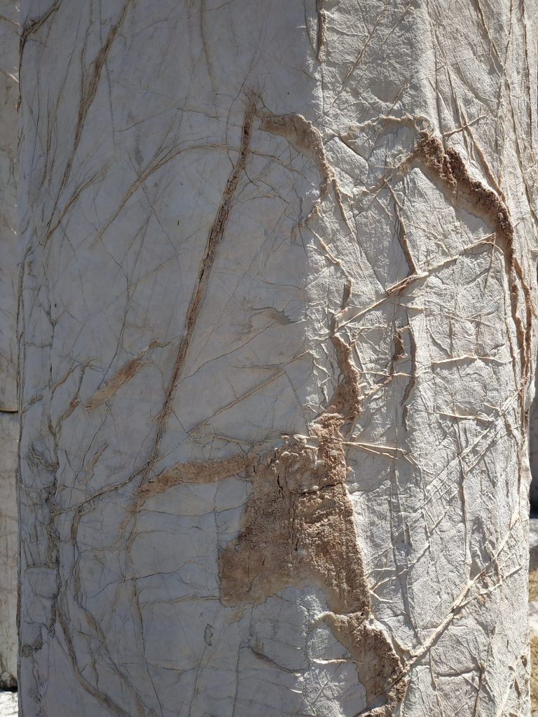 Les piliers de ses colonnes présentent des surfaces très variables, certaines en pierre dense et uniforme, d’autres sont porteuses de traces, de veinures. Certaines ressemblent à s’y méprendre à des fragments de brindilles de bois !