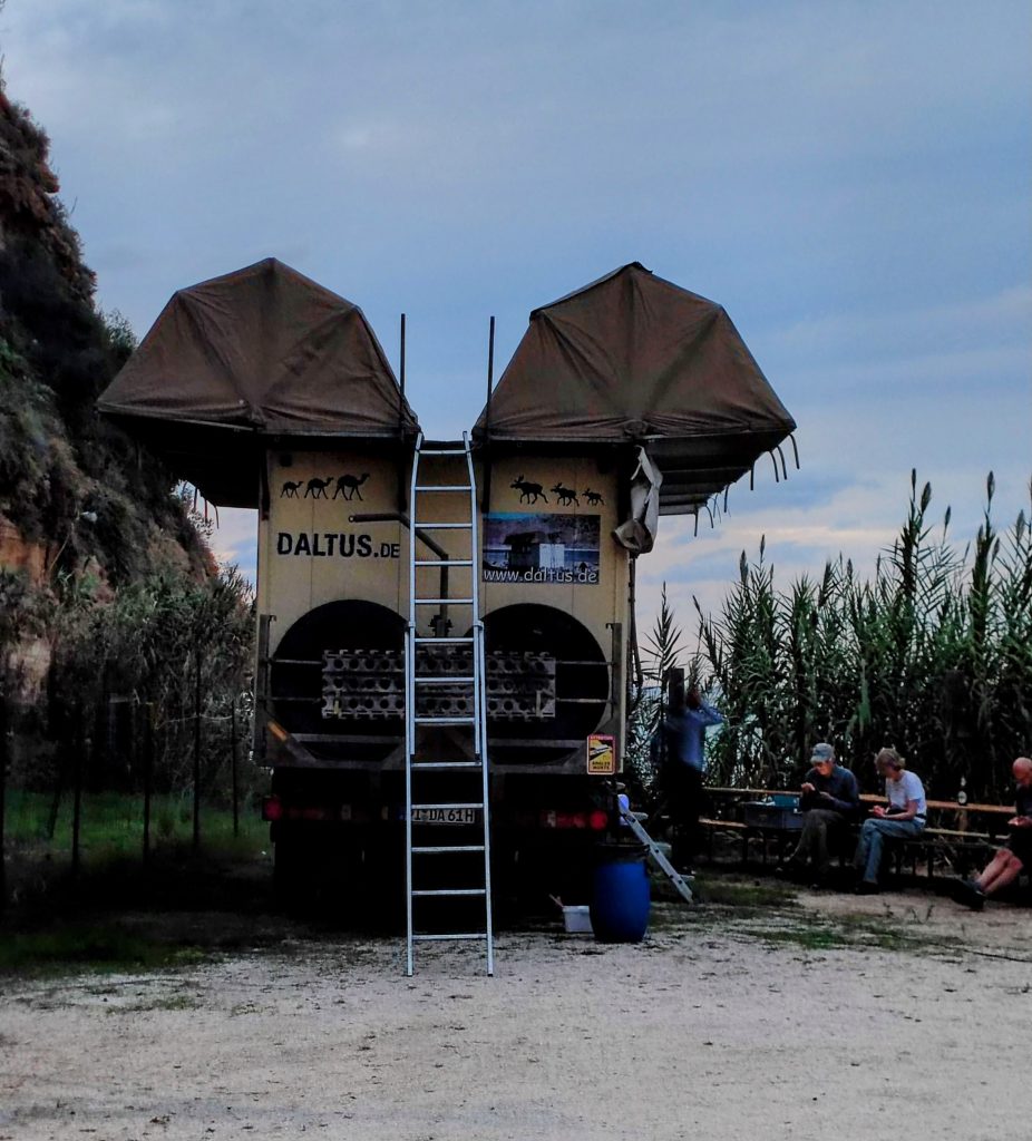 Ce drôle d’attelage a débarqué un soir. Avec son air de pipistrelle baroudeuse, c’est un Daimler Benz tout terrain. On a compté 15 passagers dans ce bus d’un genre particulier, équipé de plaques de désensablement, d’une cuisine, de tables et bancs pour les repas, de deux tentes géantes sur le toit et de 25 places assises à l’intérieur. C’est l’initiative d’une petite équipe allemande de fondus de voyages qui proposent à leurs clients des voyages en petits groupes un peu partout dans le monde.