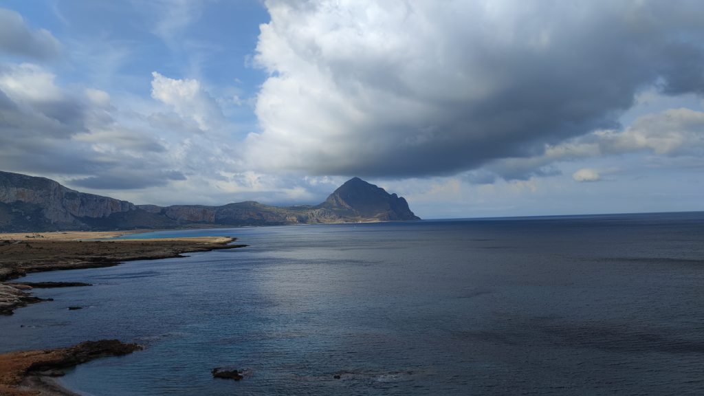 Un regard en arrière sur la côte près de Macari et ce matin nous prenons la route pour Erice, tout là haut sur son piton rocheux à 800 mètres d’altitude.