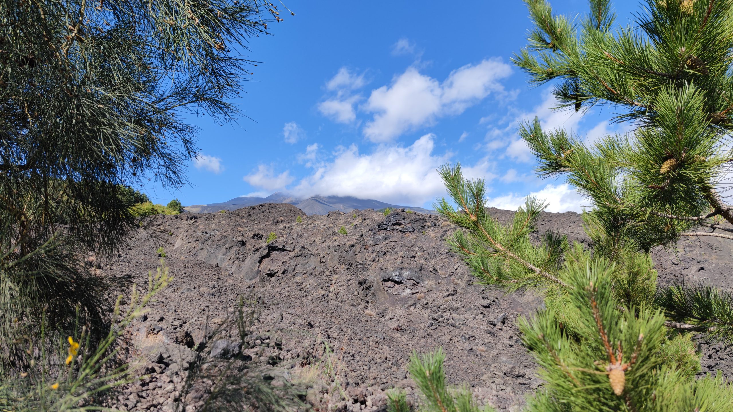 Première approche de l’Etna, qu’on a vu émerger peu à peu sur la route depuis la côte. On le guettait…